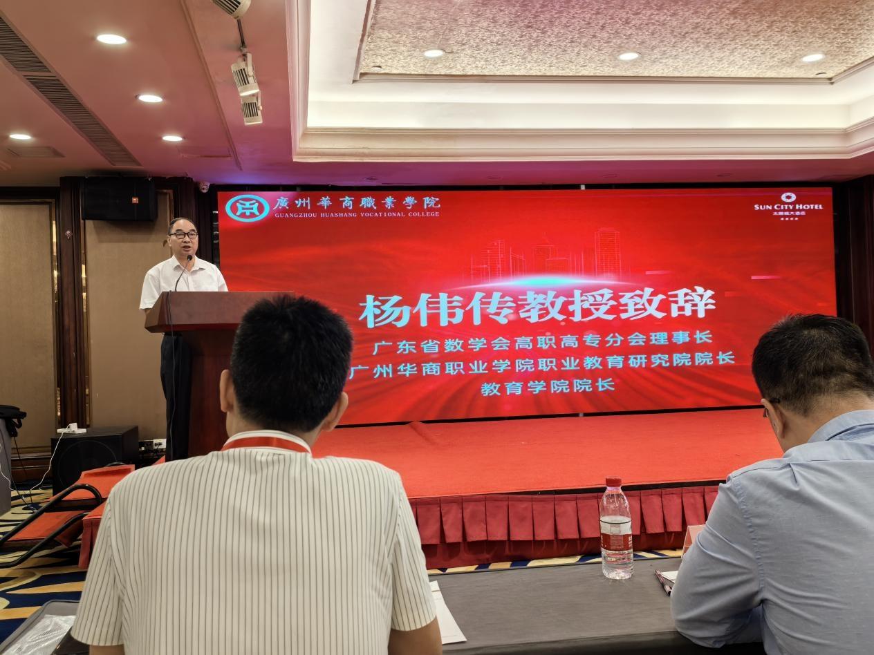 广东省数学会高职高专分会理事长、广州华商职业学院职业教育研究院院长兼教育学院院长杨伟传也发表讲话。他欢迎嘉宾到来,感谢广州华商职业学院的支持,指出当前职业教育处于关键阶段,数学对人才培养意义重大。他介绍本次年会以 “AI 赋能高职数学高质量发展” 为主题,将围绕课程与岗位对接、智能教学工具应用、职业本科数学素养培养展开研讨,同时坦言高职数学教育面临的挑战,期待同仁通过交流凝聚共识,推动数学赋能学生与产业,预祝年会圆满成功。