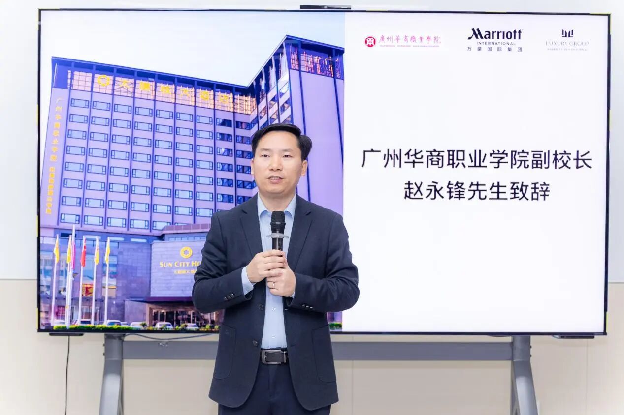 活动伊始,广州华商职业学院副校长赵永锋致辞。他对万豪国际集团大中华区奢华品牌的各位嘉宾表示热烈欢迎,对酒店管理与厨艺学院毕业班同学及英才班候选学子寄予殷切期望。他指出,万豪国际集团作为全球酒店业标杆,以卓越服务、文化底蕴和国际网络著称,此次校企深度合作,标志着我校在校企协同育人、深化产教融合方面又迈出了重要一步,为华职学子搭建通向国际顶尖酒店管理集团的桥梁,开辟更为多元的职业发展空间。