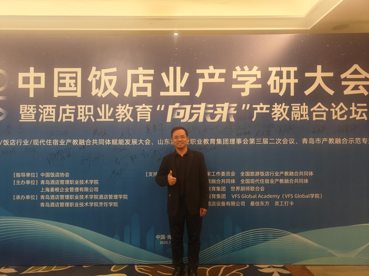2025年11月6日至7日,2025年中国饭店业产学研大会暨酒店职业教育“向未来”产教融合论坛在山东青岛成功举办。本次大会由青岛酒店管理职业技术学院与上海姜根企业管理有限公司联合主办,以“全球化与数智化背景下的产教融合价值共创:链接·协同·跃迁·共生”为主题,汇聚全国旅游饭店行业产教融合共同体成员单位、相关院校及企业代表,共探酒店职业教育产教融合创新发展路径。广州华商职业学院委派酒店管理与厨艺学院何洪健副院长作为代表参会,学校凭借在职业培训领域的卓越成果,荣获“万豪国际大中华区职业培训先锋奖”。