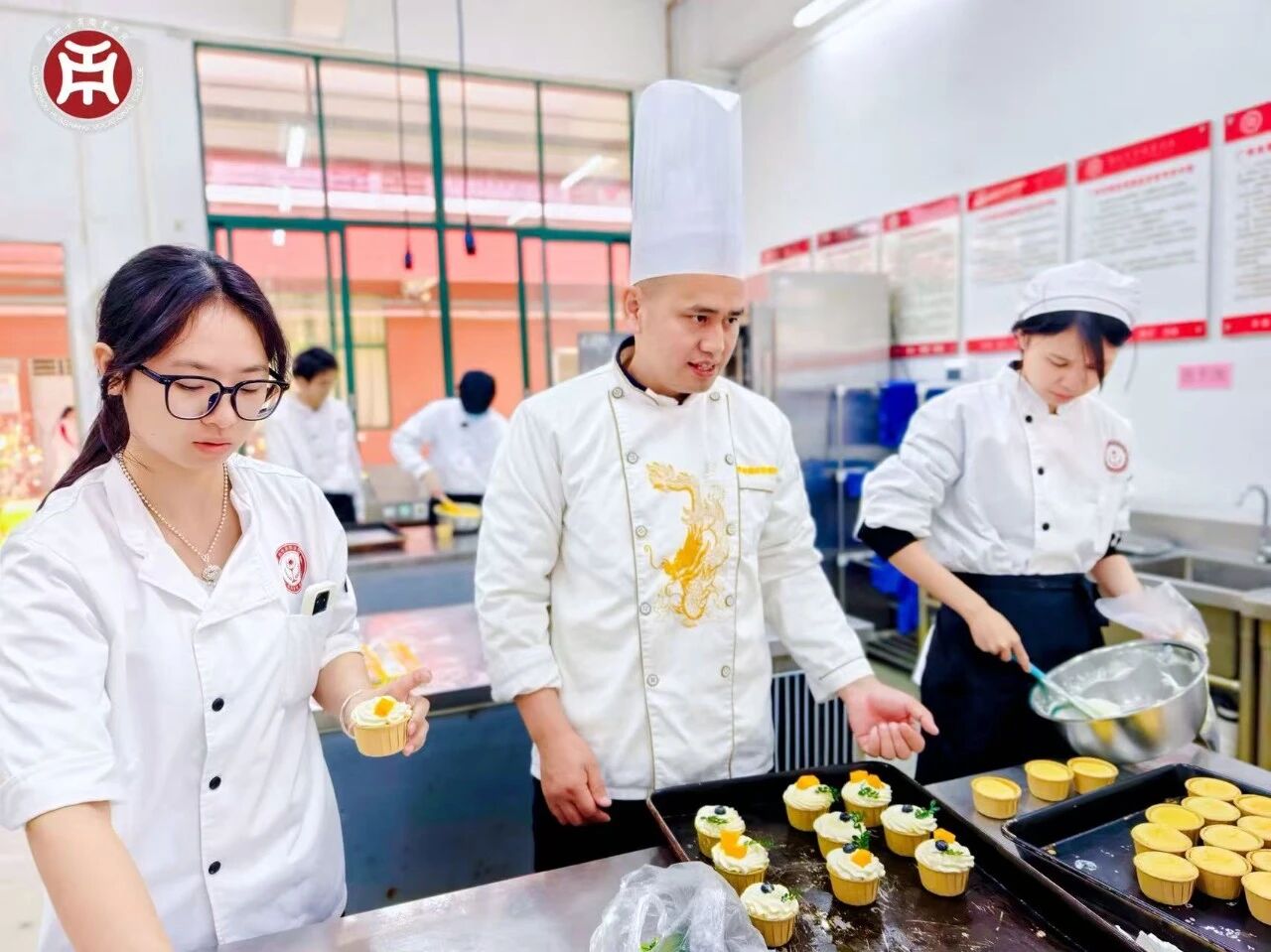 此外,酒店管理与厨艺学院中西面点工艺专业老师带领10余名学生制作了奶油布丁、酥皮泡芙、华商曲奇、萄式蛋挞、沙湾鲜奶挞、虎皮蛋糕、水果蛋糕、桃花酥、巴斯克蛋糕等茶歇点心。种类丰富的茶歇点心获得评委、专家们的一致好评,充分展示了学院的产教融合实践教学成果。